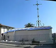 The outside of the chapel is white. The top of the roof is decorated with a blue-and-white zigzag pattern and carries an elaborate metal cross with a bell.