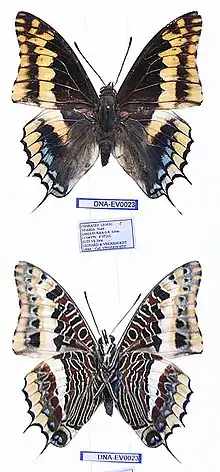 Historical attempts to assemble a cluster of presumably related species into a "Charaxes jasius Group" have not been wholly convincing. More recent taxonomic revision,[7] corroborated by phylogenetic research, allow a more rational grouping congruent with cladistic relationships. Within a well-populated clade of 27 related species sharing a common ancestor approximately 16 mya during the Miocene,[8] 26 are now considered together as The jasius Group.[7] One of the two lineages forms a robust clade of seven species sharing a common ancestor approximately 2-3 mya, i.e. during the Pliocene,[8] and are considered as the jasius subgroup.[7]