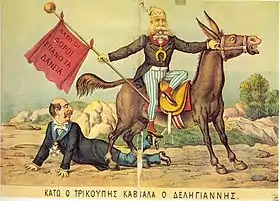 Greek satirical poster of 1895 depicting Trikoupis and his main political opponent Theodoros Deligiannis. The flag reads: "down with the taxes, up with the loans!"