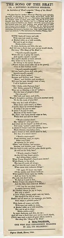 1 sheet ; 40 x 11 cm "The Song of the Brat! : or, A Mother's Manifold Miseries" by Clark, Charles, 1806–1880, printer