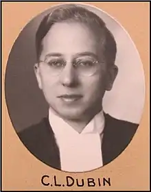 Charles Leonard Dubin was born on April 4, 1921, in Hamilton, Ontario, the son of Harry and Ethel Dubin.[1] He received a B.A. from the University of Toronto in 1941 and an LL.B. from Osgoode Hall Law School in 1944. He was called to the Bar of Ontario in June 1944 and was created a King's Counsel in December 1950.[2][1] In 1945, he married Anne Levine, who died in 2007. They had no children.[1]
