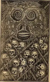 After being told by a group of locals on the island of Massid (Yorke Island, or Masig) that men from Aureed had taken skulls back to that island, Lewis went to explore the group of small islands that he called the "Six Sisters", one of which was Aureed. Anchoring there, armed men went on to the island and found it deserted, the village abandoned. After burning the village to the ground, the men found a dilapidated shed, and in it a huge mask made of a single decorated turtle shell surrounded by human skulls of Europeans. This was later identified as a "skull house" used by the followers of Kulka. Lewis and his men took the skulls and mask, and set fire to everything on the island, including plantations of tobacco. Lewis dubbed the island "Skull Island", although this name was not taken up.[7]