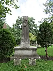 A monument with a tall shaft marks the Evans' graves, the front of which is inscribed with the following tribute to Evans:[43]