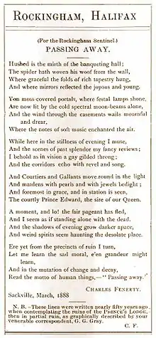 As a young man, Fenerty began writing poetry; his first (known) poem, written when he was 17 years old, was titled "The Prince's Lodge" (later retitled as "Passing Away" and published in 1888). It described an abandoned, decaying home overlooking the Bedford Basin near Halifax. The lodge had been built decades prior by Prince Edward, Duke of Kent and Strathearn, who later returned to England.[8]