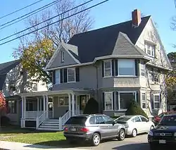 The Charles H. Burgess House is a historic house at 17 Whitney Road in Quincy, Massachusetts. The 2+12-story wood-frame house was built c. 1903 by Charles H. Burgess, a real estate developer and auction-house owner. The house exhibits both Queen Anne and Shingle styling, with Queen Anne-like projecting corner bay, and a wraparound porch supported by paired columns. Decorative cut shingles make a string course under a slight flare at the base of the second floor.[2]
