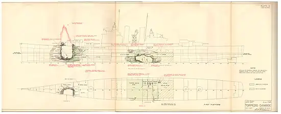 Captain Cecil had positioned himself on the "fighting bridge", an open-air command area. This was just below the forward main battery directors in an area that protruded a bit, giving him panoramic observation of events. Directly below Cecil's position was the enclosed pilot house, where Commander Carpenter stood overseeing operations there. Communications were done through a voice tube.[33] Before Helena opened fire to port at 01:57, Carpenter and the rest of the crew were at their battle stations. About seven minutes after she opened fire at about 0203 hours, Helena was hit by a torpedo. The first enemy Type 93 torpedo, also called a Long Lance, could travel at 48–50 knots (89–93 km/h; 55–58 mph) and impacted Helena on the port side just below the number one turret (near frame 32), tearing off the bow of the ship. As the tall column of water thrown up by the explosion began to fall, the ship staggered and then began to surge ahead as the bow sheared off to starboard.[33][34]