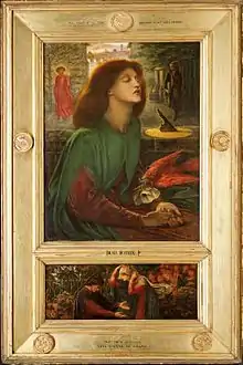 Beata Beatrix - Dante Gabriel Rossetti - Artist's rendition of his original painting but adding a predella depicting the artist and his wife (the model of the painting in the upper panel) meeting in paradise, with a frame designed by Rossetti. Hutchinson had acquired the painting in London for his private collection in 1883 and paid £ 1,200 for it[94] (about $97,000 in 2015).