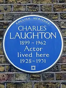 Laughton was born on 1 July 1899 in Scarborough, North Riding of Yorkshire, the son of Robert Laughton (1869–1924) and Eliza (née Conlon; 1869–1953), Yorkshire hotel keepers.[4] A blue plaque marks his birthplace.[5] His mother was a devout Roman Catholic of Irish descent, and she sent him to briefly attend a local boys' school, Scarborough College,[6] before sending him to Stonyhurst College, the pre-eminent English Jesuit school.[7] Laughton served in World War I, during which he was gassed, serving first with the 2/1st Battalion of the Huntingdonshire Cyclist Battalion,[8] and then with the 7th Battalion of the Northamptonshire Regiment.
