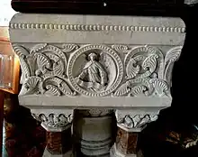 The building incorporates almost 300 pieces of 12th century sculpture.[1] "Care was taken to reuse and preserve as much of the original sculptural decoration as possible, generally with original sculpture reused internally with new sculpture employed externally." There are fifteen carved panels around the doorjambs of the south porch; five of these are mediaeval; the rest are "high quality Victorian reproductions" by Mawer. Regarding the inner porch doorway: seven of the doorjamb stones are mediaeval, and five are by Mawer. The chancel arch, in imitation of an original voussoir found in a wall, is by Mawer. Of the eight capitals supporting the arch, six are original and two are "high quality" works by Mawer.[20] Charles "executed fine neo-Romanesque carving" to replace or repair stones in the restoration of this building.[1][25] "The font at the west end is of Caen stone, on alabaster shafts and capitals. It is the work of Mr C. Mawer, of Leeds,"[22] and carved "in a rather elaborate Norman style."[21]