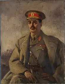 In England attending the Staff College at Camberley when the First World War broke out, Melvill returned to his former unit, the South Lancashire Regiment.[2] He embarked for the Western Front in August as part of the "Old Contemptibles" and was wounded the following month. After recovering from his wounds, he was posted to the School of Instruction, Westminster Command, as chief instructor. He then served as brigade major for the Tay Defences from May to September 1915 before transferring to the New Zealand Expeditionary Force (NZEF), which at the time was engaged in the Gallipoli campaign.[1] Initially a staff officer, he served under Brigadier General William Braithwaite as brigade major of the New Zealand Rifle Brigade following the evacuation of the Allied forces from Gallipoli in December.[1][5]