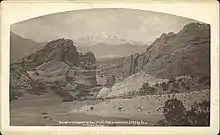 By 1866 Savage's Views of the Great West, a stereoscopic series, was sold by the Union Pacific and Denver & Rio Grande Western railroads. These railroads gave him a free pass to ride wherever he wanted.[10] The same year he took a tour of major photography studios in the United States, both to improve his photography skills and to publish reproductions of his photos. In San Francisco, he met Carleton Watkins, who described his method for producing large works by placing developed negatives in a water bath until he was ready to finish them. Savage noted that Watkins's method was cumbersome, but envied his results.[19] He traveled by boat to New York City, where progress in photography instruction and technology inspired him. While in New York City, he made an agreement with Samuel R. Wells, who sold photos that Savage took, while Savage sold Wells' publications in his photography studio back in Utah. Savage made similar agreements with other distributors.[20] After having a darkroom wagon custom made, spending $3,400 on photographic supplies from E. and H.T. Anthony Co., he traveled with a group of Mormon settlers back to Salt Lake City.[21] Most of his new supplies were lost when his wagon tipped over while crossing the Platte River on his return trip. Savage paid back some of the debt over nine years, but stopped paying when he was on the verge of bankruptcy. The company sued him, and after a long legal battle, the debt was settled in 1883.[22]
