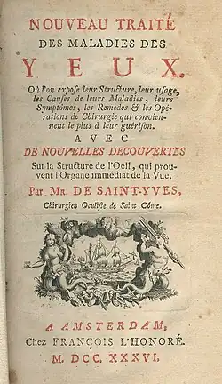 Based on such experience and his large fame, Saint-Yves published in 1722 a treatise of descriptive pathology that durably set out as a pillar of the French school of ophthalmology : Nouveau traité des maladies des yeux où l'on expose leur structure, leur usage, les causes de leurs maladies, leurs symptômes, les remèdes et les opérations de chirurgie qui conviennent le plus à leur guérison, avec de nouvelles découvertes sur la structure de l'oeil, qui prouvent l'organe immédiat de la vue, par Mr de Saint-Yves, chirurgien occultiste de Saint Côme (New treatise of eye pathologies, with description of eye structures and uses, the origins of their illnesses along with their symptoms, the most appropriate remedies and surgery treatments, including new discoveries concerning eye structure that prove the exact location of sight, by Mr de Saint-Yves, eye surgeon at Saint-Côme).