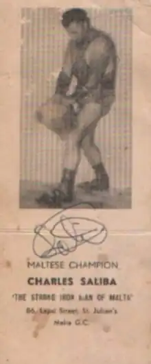 Charles "Ironman" Saliba (1929-1982), was a performing oldtime strongman from the island of Malta who performed feats of strength shows during the 1960s, 1970s and early 1980s. Saliba was known as the "Ironman" or the "Man of Iron" and was also known as the strongest man in Europe.[1][2][3][4]