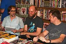 Soule (right) with (from left) fellow writers Joe Infurnari and Jeffrey Burandt at a signing at JHU Comics in Manhattan