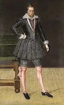 Stanhope is remembered for an anecdote about the fate of the wardrobe of Elizabeth I of England which he recorded in the margin of his copy of Cresacre More, The Life and Death of Sir Thomas More (1642), the book is now in the Folger Shakespeare Library. The marginalia asserts that George Home, 1st Earl of Dunbar, the new Scottish master of the wardrobe realised £60,000 from the sale of the late queen's clothes, and spent £20,0000 on the house he built at Berwick Castle.[4] A similar story was recorded by Symonds D'Ewes on 21 January 1620, according to the antiquary Thomas Astle, that King James had given the late queen's wardrobe to the Earl of Dunbar, who had exported it to the Low Countries and sold it for £100,000.[5] Stanhope's father, Sir John, had a connection with the wardrobe, having been tasked with making an inventory of royal apparel in 1604, and worked in Parliament to forward the Earl of Dunbar's business.[6]