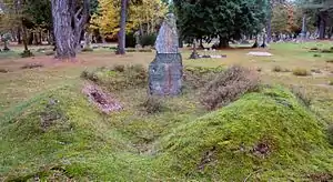 His grave in Brookwood Cemetery is designed to resemble a prehistoric barrow with the upright stone being made from serpentinite.[1]