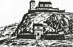 In the summer of 1541, after arriving on his third and final voyage, French explorer Jacques Cartier established the fort and a settlement of 400 people.[2] It consisted of an upper fort, and lower fort located near the confluence of Rivière du Cap Rouge at the north shore of the Saint Lawrence River. The upper fort, at an elevation of 40 metres (130 ft), offered a strategic defensive position, while the lower fort provided a potential anchorage for ships. The two forts had three towers. Charlesbourg Royal was named after Charles II, Duke of Orleans, third son of King Francis I of France.