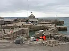 Charlestown grew out of the small fishing village of West Polmear (or West Porthmear), which consisted of a few cottages and three cellars, in which the catch of pilchards were processed.[2] The population amounted to nine fishermen and their families in 1790.[3] Before the harbour was built, trading vessels landed and loaded on the beach.[4] Charles Rashleigh, who moved to Duporth Manor, just outside the village, used plans prepared by John Smeaton to begin the construction of a harbour and dock in 1791. After building the outer pier, he excavated a natural inlet to form the main dock and a shipyard at its inner end that was demolished when the dock was extended.[2] The first dock gates were completed in 1799.[5] To maintain water levels in the dock, a leat was constructed, which brought water from the Luxulyan Valley, some 4 miles (6.4 km) away.[6]