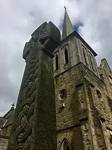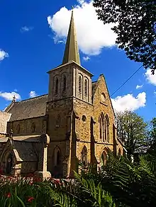 The parish of Charlestown was created in 1846 by the Diocese of Exeter, when the population of the village was about 3,000 people. It was split from the parish of St Austell, and land was given for a church in 1848 by George Augustus Crowder, the managing director of Charlestown Estates. Construction of St Paul's Church began the following year and was completed in 1851.[21] It was designed by Christopher Eales, and has a nave and chancel with transepts and north and south aisles. It is constructed of rubble with granite dressings. The tower at the western end did not have a spire until 1971, when a glass-reinforced plastic structure was added. The south aisle has late-19th-century stained-glass memorials to five local families. The church has been Grade II listed since 1999.[22] St. Paul's (see gallery of images[23]) is an Anglo-Catholic church in the Oxford Movement style of worship in the Church of England.