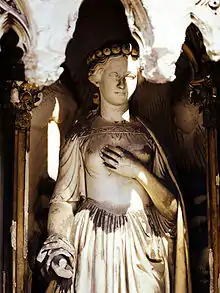The monument is constructed of white Carrara marble in the style of a tabernacle and features Gothic Revival architecture stylings such as spires, carved flowers, and angels. A large statue of Canda in her birthday gown is displayed beneath a marble canopy.[6] In an 1893 article, The New World remarked on her "fair form still preserved in Marble."[5] Sculptor Launitz did the tomb design work along with Frazee,[6] although Frazee's role has been called into question by some of his biographers.[8] The design was based in part on Canda's own sketches for a memorial to her aunt, Clemence Canda,[2] who had died the year before.[7][5][9]