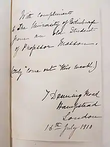 In 1865 Sarah Mair founded the Ladies' Edinburgh Debating Society, which published a regular writing journal, The Attempt. Charlotte Carmichael had become a member by 1866 and published sundry pieces in The Attempt. In a meeting of the society in 1867 Mary Crudelius presented her initiative of creating classes for women at a university level under the auspices of the Edinburgh Ladies' Educational Association. Charlotte Carmichael was present at the meeting. She pledged her willingness to attend such classes and guaranteed another twelve interested persons.[5] The first classes began in 1868, taught by Professor David Masson, Professor of English Literature at Edinburgh University,[5] 'at a time when the University was not open to women and courses were given to them privately by the male Professors'.[6] Although women were not permitted to take a degree, she achieved the highest certificate then available to a female student, in subjects as diverse as literature, philosophy and science, achieving first class honours.[6] In fact, she "was the first woman in Scotland to gain a Certificate of Arts".[7] She used her education for the advancement of women and pursued scholarly interests in English Renaissance, particularly Shakespearean, literary history.