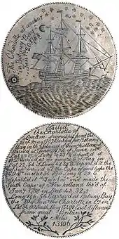 The Charlotte Medal is a silver medallion, 74 millimetres (2.9 in) in diameter, depicting the voyage of the convict transport Charlotte, with the First Fleet, to Sydney, New South Wales, Australia. Its obverse depicts the ship and the reverse is inscribed with a description of the journey. Struck by convict Thomas Barrett upon arriving in Botany Bay aboard Charlotte in January 1788, the medal is said to be the first work of Australian colonial art.[1] Within a month, Barrett became the first person to be executed in the new colony.