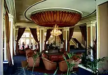 The hotel was lavishly appointed, with panoramic window views, hot and cold running water in every room, and custom-made high-quality furniture.[4] Most of the staff were recruited from overseas.[4] The innovative heating system used enormous boiling-water tanks in the basement and pumped hot water up five storeys; originally coal or oil heated, it was switched to electricity and still operates today.[1] The total cost was £88,000 (well over the contract price) of which the hotel had cost £78,000, while at the request of the Tourist Company another £10,000 had been spent building extra wooden buildings, a garage and a golf course in the front of the hotel. The golf course was designed by an architect serving a prison sentence and built by prison labour.[8] Wigley had led Fletchers to believe that if they overspent the company would be reimbursed by the Mount Cook Tourist Company. Unfortunately due to the Depression it was in difficulties and so would not pay for the increased expenditure. James Fletcher, the head of the company, approached the Prime Minister Sir Joseph Ward and asked him to increase the government loan to £60,000. Ward agreed and Fletcher obtained a promise from Wigley that the bulk of this injection of money would go to pay Fletchers. The Tongariro Park Tourist Company was by now in serious financial trouble, which was not helped by spending lavishly fitting out the hotel. Wigley reneged on the deal and passed on only £10,000. The onset of the depression delayed hopes of a tourism boom; to secure their debt Fletchers put the Tongariro Park Tourist Company into receivership in February 1931, took control of the hotel, and ran it for 3 months before walking away with a loss of £19,000, (which included £1000 of losses incurred during their period of ownership).[9]