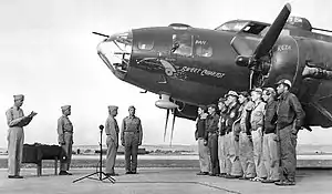 Gen. Jimmy Doolittle awards the Purple Heart to the aircrew of Boeing B-17E Fortress 41-9021 ‘Sweet Chariot’ at Chateau-dun-du-Rhumel Airfield, Algeria, July 1943.