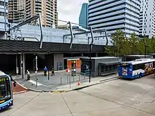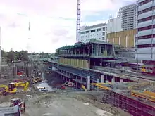 The new station precinct is known as the Chatswood Transport Interchange (CTI) and consists of the railway station, a bus interchange and pedestrian pathways connecting the precinct to the surrounding streets. The CTI was constructed as a Public Private Partnership and was to include a new shopping plaza called Metro Chatswood and three towers. The private developers, CRI Chatswood, went into receivership whilst construction was underway.[8] As a result, the shopping centre remained closed until 2014 and major construction of the towers was delayed for several years.
