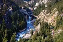 The Cheakamus River derailment occurred on August 5, 2005, when nine cars that were from a Canadian National Railway freight train derailed and crashed into the Cheakamus River in British Columbia. The cars contained approximately 40,000 litres of caustic soda (sodium hydroxide), which entered the river, killing more than 500,000 fish from 10 different species, including chinook salmon, coho salmon, pink salmon, and rainbow trout, both freshwater and ocean-dwelling.[1] Juvenile rainbow trout were the most affected at a mortality rate of 90% and it was also estimated that the adult chinook salmon mortality rate reached 50%.[2]