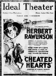 Cheated Hearts is a 1921 American silent drama film directed by Hobart Henley and featuring Herbert Rawlinson, Warner Baxter, Marjorie Daw and Boris Karloff.[1] The screenplay was written by Wallace Clifton, based on the novel Barry Gordon by William Farquar Payson. The film's tagline was "All the Exotic Glamour of the East Woven in a Livid Picture of Love" (Print Ad in the Seattle Star, ((Seattle, Wash.)) 24 December 1921). It was shot in Universal City, and is today considered a lost film.[2]