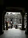 The Keshava temple at Somanathapura faces east and is enclosed in a walled courtyard with a major gate (mahadvara).[19] Outside the walls before the gate stands a tall pillar, which once had a Garuda statue on top, now missing. Inside the gate, to the left are vertical standing inscription stones. These stones have the form of the hero stones, with the top decorated with Hindu iconography as well as miniature reliefs of Keshava, Janardhana and Venugopala. The inscription is in old Kannada. The small entrance mandapa is supported by lathe-carved soapstone pillars.[4][19] The temple is carved from soapstone, a green-grey chloritic schist material that is soft in quarry but hardens when exposed to air. This is not locally available and must have been imported from another part of South India. It enabled the artists to shape and carve out intricate details for the artwork.[20][21]