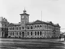 The Chief Post Office or Christchurch Central Post Office, originally known as the Government Buildings,[1] is located in Cathedral Square, Christchurch, New Zealand. The building was initially a post office with Immigration, Customs and Public Works departments. The Government Buildings were later replaced by the new Government Buildings[2] opened in 1913,[3] and the Chief Post Office remained on-site. In 1881, New Zealand’s first telephone exchange was installed in the building. Post services were offered from the building until 2000 when it was re-purposed to house a Christchurch tourist information centre and a restaurant, café and offices.[4] Following the 2011 Christchurch earthquake the building closed. In the early 2020s repairs and strengthening[5] took place. The building is planned to reopen in 2023 in stages, and will eventually include a restaurant, shops, and a visitor information centre, under the name "The Grand".[6] The structure is registered with Heritage New Zealand as a Category I heritage building.
