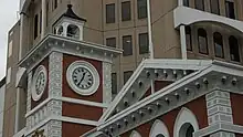 Reputed to be a replica of London's Great Clock of Westminster,[8][28] a working, free standing, four faced turret clock was installed in 1879 within a clock tower.[29] Underneath the east facing clock face is the Royal coat of arms of the United Kingdom.[12] Notable for being unreliable, an electric clock was eventually installed to control the visible faces as slave clocks. While at one time it chimed on the hour and at the quarters,[30] after the mechanisms were damaged in a 1980s fire, the clock became silent.[8]