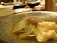 Chikuwabu (ちくわぶ) is a wheat-based Japanese food item that is frequently eaten as an ingredient in oden. Similar to the process used to make udon, dough is made by kneading flour with salt and water and then formed into a thick cylindrical shape with a hollow tube through its center and steamed.[1] It is particularly popular as an ingredient in Tokyo, but it can generally be found across Japan in supermarkets and specialty stores.