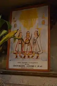The Martyrs of Tlaxcala were three Mexican Roman Catholic teenagers from the state of Tlaxcala: Cristobal (1514/15–1527) and the two companions Antonio (1516/17–1529) and Juan (1516/17–1529).[2][3] The three teenagers were converts from the indigenous traditions of their families to the Roman Catholic faith and received their educations from the Order of Friars Minor who baptized them and evangelized in the area. Their activism and evangelical zeal led to their deaths at the hands of those who detested their newfound faith and recognized them as dangers to their values and rituals.[4][5]