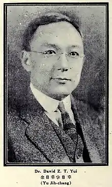 The NCC's last meeting before the war had been in 1937.[35] Much of the personnel of NCC was unable to work and it took many months after the surrender of Japan in August 1945 to have them back to the formerly Japanese-occupied areas.[36] Eventually, a meeting was convened in December 1946 and S. C. Leung emerged as the new chairman.[35] In the midst of the transition period, the NCC spoke against corruption and social injustice, but considering the handover of all political affairs to the Chinese Communist Party (CCP), this was "too little too late". Chinese Protestant churches were unable to attain a level of independence from foreign missionaries under the NCC, which would bring their loyalties under question.[37] Part of the problem was leadership.[38] In late 1930s, Wu Yi-Fang had become chairperson, Ronald Rees secretary,[1] Earl H. Cressy secretary of the commission on Christian education,[39] and Edward H. Hume was secretary of the commission on Christian medical work. Edwin Carlyle Lobenstine was honorary secretary, and T. T. Lew was head of the National Committee for Christian Religious Education in China.[40] Chen Wen-Yuan became the general secretary in 1936 and, later, honorary general secretary.[41] Historian Daniel Bays writes: "To me, it seems likely that the NCC sorely missed the leadership of Cheng Jingyi and Yu Rizhang [David Z. T. Yui]". Both had died in the 1930s.[38]