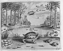 Illustrations play an important role in most of Kircher's works and they "have a quality of ingenuity and strangeness that are particular to his century".[15] China Illustrata contains a number of realistic depictions of Chinese plants and animals, but also fictitious images, such as the "Dragon and Tiger mountain" (China Illustrata, p. 171) said to be existent in the Orient. Although Kircher himself did not create most of the images, he chose them wisely in order to elucidate the descriptions found in the text.[15]