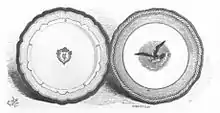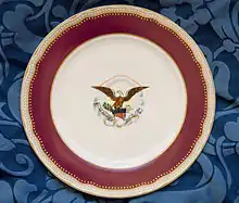 On May 15, Mrs. Lincoln visited the china showroom of E. V. Haughwout & Co.[22] Haughwout's showed her a "specimen plate" they had exhibited at the Crystal Palace Exhibition in New York in 1853.[23][24][25] The company had produced the plate in the hopes that President Pierce would like it and buy a set of china based on its look.[26][27] The "Pierce Plate" was a creamy white porcelain emblazoned with the arms of the United States.[28] These depicted an America eagle in the Napoleonic style (slender wings outspread, slender neck and head, facing right, leaning left), gripping a shield emblazoned with the U.S. colors (white band at top rimmed in blue, with blue stars on the field, and narrow red and white stripes below). The shield tilted to the right, and the lower southeast corner was lost in rosy clouds which surrounded and were in back of the eagle. Drifting through the clouds left and right of the shield was a ribbon with the national motto ("E pluribus unum"). An olive branch extended to the left, and a sheaf of arrows to the right. A wide dark blue border,[28][27] its outer rim dotted with tiny white stars, encircled the plate. The beyond that was a twisted gold rope ("in the Alhambra style").[24][28][27] The edges of the demonstration plate were lightly scalloped.[29]