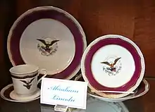 The Grant administration ordered 275 replacements (which included 72 cups and saucers) for the Johnson "solferino" set in 1873.[24] It was delivered on December 10, 1873.[70] The porcelain was manufactured by Haviland[71] and imported and decorated by the firm of J. W. Boteler and Brother of Washington, D.C.[24] The service consisted of plates in three sizes, compote dishes, and cups and saucers, and cost $1,207.21.[70] This china may be identified by the words "Fabriqué par Haviland & Co./Pour/J. W. Boteler & Bro./Washington", which is painted or stamped on the back.[23][72] By the end of the first Grant administration, there was not enough left to set dinner for eight or nine people.[68][lower-alpha 10]