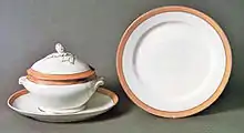 In late 1864, Mrs. Lincoln ordered a new set of china for family, non-state dinners in the White House.[34] This time, the importer was China Hall, a company owned by James K. Kerr of Philadelphia.[23][34] The design this time was extremely simple: A white plate, with a buff border edged in gilt lines.[23][80] This 511-piece set consisted of dining plates, soup plates, dessert plates, ice cream plates, a wide variety of dishes (large and small fish platters, vegetable platters, side dish platters), tureens, sauce boats, pickle dishes, salad bowls, custard cups, fruit baskets (round and oval), fruit platters, sugar bowls, coffee cups and saucers, and other items. This 181-piece set cost $1,700, and was billed on January 30, 1865.[80] It's not clear which firm manufactured the china, but it is clearly of French manufacture.[81]