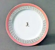 The "pink set" was provided by James K. Kerr of Philadelphia.[87] The china has a pink border. Inside the border is a gold Greek fret motif, and a gold monogram capital letter "L" is centered in the plates and saucers.[81] Kerr most likely decorated the piece, or at least provided the gilding and monogram.[89]