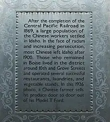 - ↑ "Historic Site: Boise Chinatown | Boise Arts & History". www.boiseartsandhistory.org. Retrieved 2022-05-21.