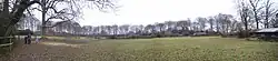 The earthen ramparts of the sub-oval shaped fort are today largely overgrown with a double belt of mature beech trees, planted in the early 19th century. Inside the ramparts the enclosed area is a level plateau 10 acres (4.0 ha) in area, treeless and given over to grazing. There are four entrances to the central enclosure, though only one is thought to be original.[2] Most of the ramparts still remain well-preserved, though along a 230 metres (750 ft) section of the southern side the ramparts are missing. The absence of earthworks in this section today is believed to be due to the demolition of ramparts to make way for buildings constructed between the 16th and early 19th centuries, together with associated livestock enclosures and allotments. However, there has also been speculation that the earthworks were always much more modest along this section, providing ample opportunity to exploit as sites for domestic habitation. As properties were built and later enlarged or replaced with more substantial buildings, and their associated allotments became gardens and orchards, the residue of the original ramparts were all but rubbed out and any remaining ditches almost completely infilled. The ramparts on the south-east and south-west quadrants consist principally of two sets of banks (inner and outer) each enclosing a large ditch. On the north-east and north-west quadrant there is a single ditch bounded on each side by a bank.[6]