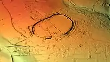 The fort is of the multivallate type, in other words having two or more lines of concentric earthworks. Most examples of such forts were built and used during the British Iron Age period between the 6th century BC and the Roman invasion of Britain in the 1st century AD.[2] The period of Cholesbury Camp's construction is unclear, but it has been suggested that it may lie between the 2nd and 1st centuries BC, during the middle to late Iron Age.[1][3] It was previously, though erroneously, attributed to the Danes and until the early 20th century was known locally as "The Danish Camp" and incorrectly recorded as such on maps.[2] It has also been suggested that it may have been constructed on the same site as an earlier, Bronze Age defensive structure.[4]