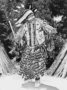 He incorporated a Sioux vest and moccasins into his costume, which he obtained through a relationship with the staff of the California State Indian Museum.[4] A photo taken in 1929 also shows him wearing a war bonnet typical of the Plains Indians. His attitude at that time was to "give his audiences the tribal regalia they expected",[4] and sometimes, he would mix "Plains and California regalia to create a suitable image."[3]