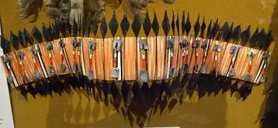 In the 1930s, he incorporated costume elements more traditional among the Miwok and other California tribes, such as the temakela, a feathered flicker-quill headband, which he made. One of his examples incorporated elements of Pomo, Maidu and Wintun traditions.[6]