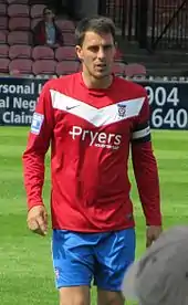 He started 2002–03 well, taking his place in the team due to injuries to other players.[25] He made his first appearance in the opening match, a 1–1 draw away to Macclesfield Town on 10 August 2002, with chairman John Batchelor claiming Smith had a "wonderful game and if we can get that sort of attitude from everyone in the team we won't have any problems".[27] Smith was dropped to the bench for a 1–1 home draw with Wrexham on 29 October 2002 due to a change in formation, having started every match in 2002–03 prior to this match, although he did play as a 48th-minute substitute.[28] He suffered a hamstring injury in early-November 2002,[29] making his return in a 1–0 victory away to Rochdale on 23 November.[30] Smith received his first red card of 2002–03 for a second bookable offence in a 1–1 home draw with Hull City on 28 December 2002, resulting in a one-match suspension.[31] This meant he missed York's match against Torquay on 11 January 2003, and after a short spell on the sidelines returned in a 2–1 home win over Macclesfield on 2 February.[30][31][32] Smith finished 2002–03 with 39 appearances for York,[30] and was described by the Evening Press as the "surprise star of the season".[33] Despite being in outstanding form and becoming a fans' favourite,[34] he was not offered a new contract with York at the end of 2002–03 by Dolan, although he hoped to still to have a future at the club.[35] This decision was reversed by newly appointed player-manager Chris Brass, and Smith signed a new one-year contract in July 2003.[36]