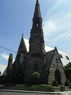 The church was constructed with granite and brownstone, with a rose window and 100 ft clock tower at the west end. The stained glass window in the chancel was designed by Louis Comfort Tiffany in the 1890s, around the same time that a new altar and reredos were acquired.[1][3] The church organ, made by Austin Organs of Hartford, Connecticut, was installed in 1964.[8]