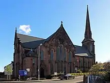 The church is constructed in red sandstone from local quarries.[5] It is roofed in Welsh slate. The plan consists of a six-bay nave, north and south transepts, a chancel with north and south aisles, and a west tower with a spire.[2] The rooms under the east end of the church are used as an office, kitchen and toilets.[5] The tower is in two stages, with a west door, over which is a quatrefoil and a clock face. The bell openings are paired, and on the tower is a broach spire with lucarnes. Along the sides of the nave the bays are divided by buttresses rising to pinnacles, and each bay contains a wide lancet window. The transepts have two bays and, because of the sloping ground, are in two storeys. There are five windows in each storey, and a rose window in the gable above. At the corners of the east end are gabled projections containing stairs and a doorway. At the east end, the aisles have paired lancets, and a doorway at the lower level. The chancel east window consists of three stepped lancets, with a rose window above. Below these are triple lancets lighting the lower area.[2]